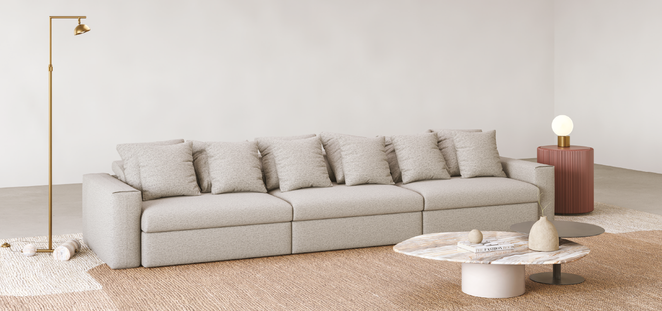 Encosto com almofadas soltas de fibra siliconada. Módulos presos com engates. Opcional: automação nos assentos e carregador USB