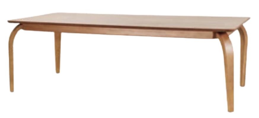 Base em madeira Tauari com acabamento em verniz ou laca fosca. Tampo em MDF revestido com lâmina de madeira natural, TS ou vidro 4mm laqueado.