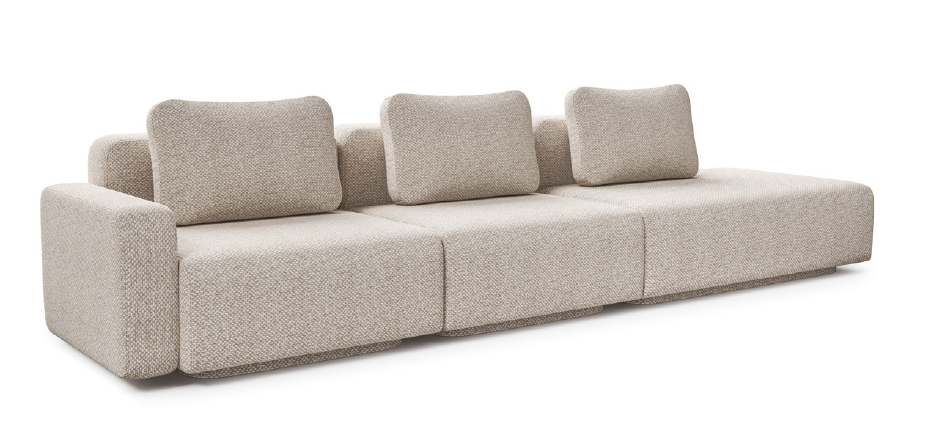 Assento fixo, encosto fixo com almofadas soltas. Módulos presos com engates