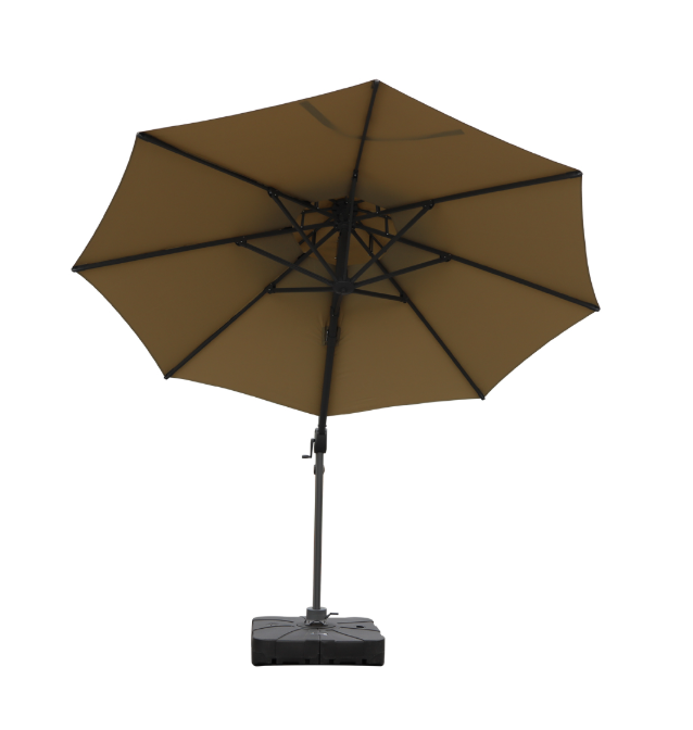 Ombrelone lateral para uso externo. Estrutura em alumínio com pintura à pó. Cobertura de 3m em formato redondo com tecido poliéster 250g/m² impermeável, revestido com poliamida e proteção UV. Rotação 360º acionada por pedal, manivela para abertura e inclinação com 6 posições. Não acompanha base.