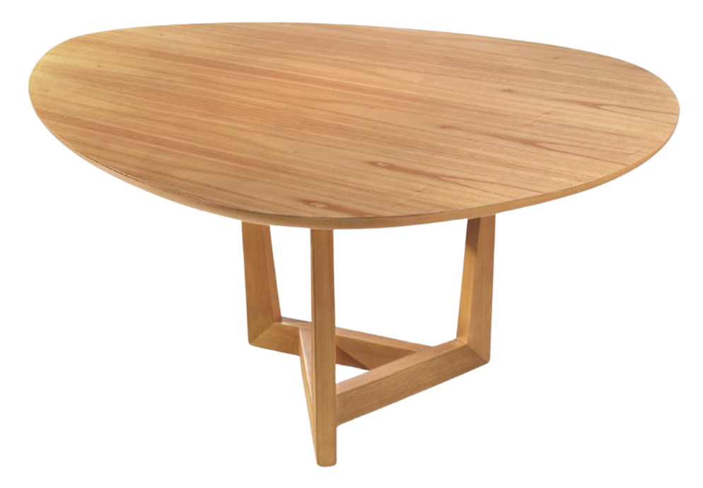 Base em madeira Tauari com acabamento em verniz ou laca fosca. Tampo em MDF revestido com lâmina de madeira natural ou TS, com formato orgânico.